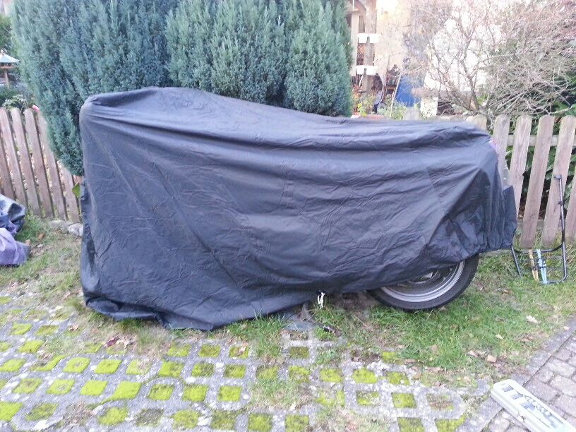 Nun habe ich mir die Abdeckplane vom Aldi zugelegt. Material ist aus reißfestem PVC, innen mit Vlies. Die Länge IST 245cm, Höhe 145cm. Sollte eigentlich alles passen, tut es aber nicht. Ich musste den Gepäckträger abschrauben und trotzdem sieht es aus als wäre sie vorne in Abendkleid und hinten in Minirock. Versuche mal ein Bild zu posten. Man kann die Plane auch nicht anders zurecht ziehen.