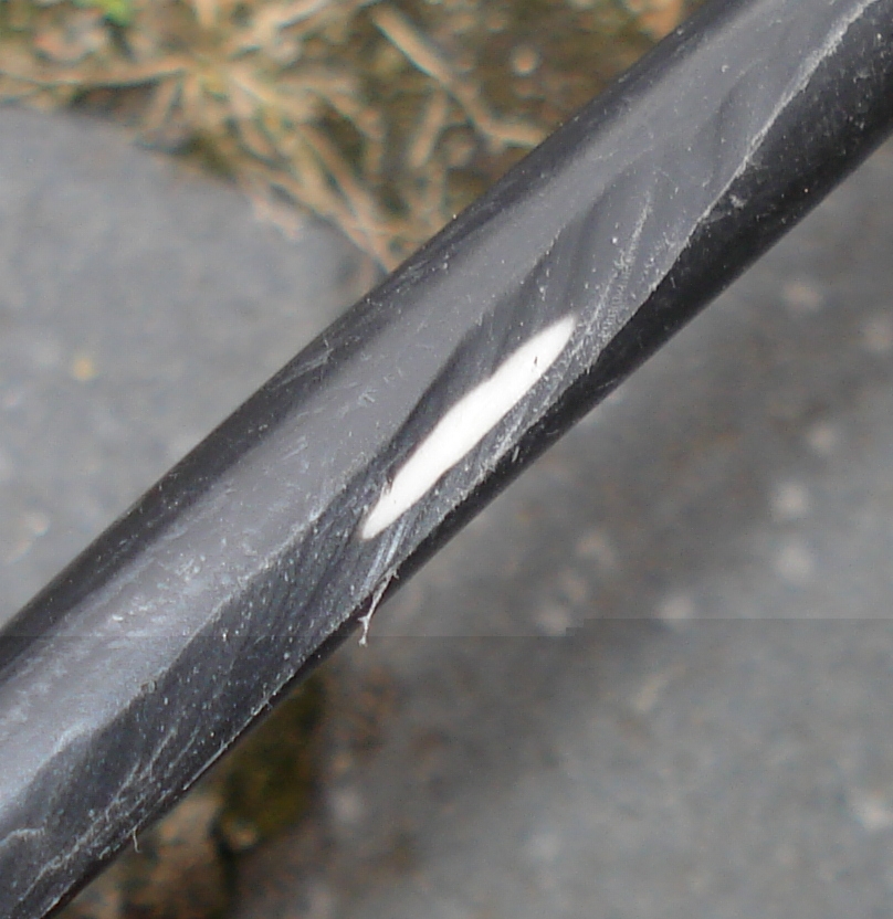 Ich hatte da so'n Malheut beim Lösen eines Knotens in meinem Verlängerungskabel und jetzt ist an einer Stelle die äußere, schwarze Gummiummantelung weggeschliffen. Die innere, weiße Ummantelung der Adern ist noch intakt.