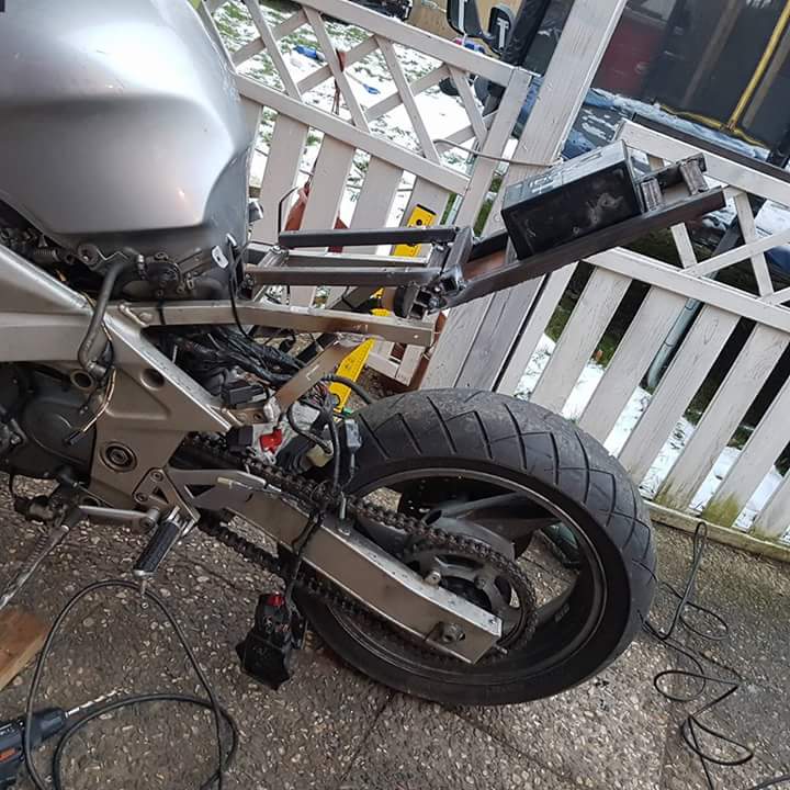Kaum zu hause, gleich die Flex in der Hand. Dann erste Anprobe. Rahmen geschweißt Dann ging es an den Zusammenbau.. So der letzte Stand der Dinge von heute: das Problem der Unterbringen der Batterie und Elektrik