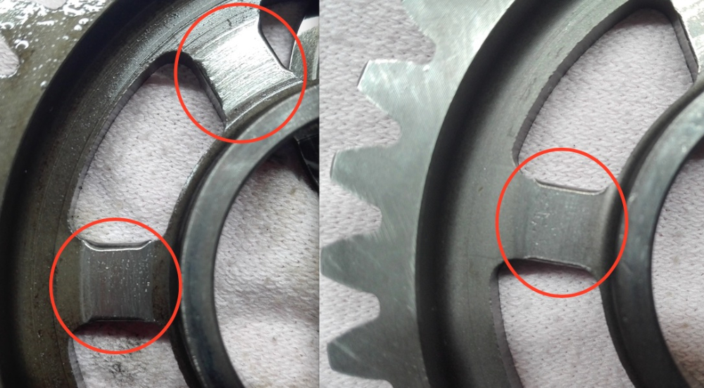 Ich habe mich mal rangewagt ein Getriebe zu zerlegen und es mal zu kontrollieren. Habe Verschleißmaße aus dem Kawa Werkstatthandbuch für die Schaltgabeln und Nuten entnehmen können und festgestellt es ist alles in Ordnung. Daher mal die einzelnen Zahnräder kontrolliert. Und siehe da die Bolzen am Abtriebsstrang doch stark rund geschliffen, genauso wie die Nuten dazu. Nun muss ich mal gucken wie und wo ich günstig die beiden Räder bekommen kann.