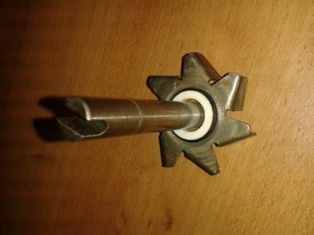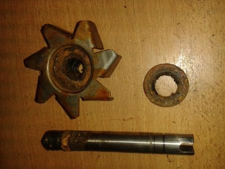 Die Welle mit dem Flügelrad ist raus. Normal lässt man sie zusammen. Ich habe die Welle aus dem Flügelrad getrieben, da bei dieser Pumpe die wasserseitige Dichtung defekt war und der Rost die Welle schon mitgenommen hat. So war alles gut zu schleifen und zu reinigen.