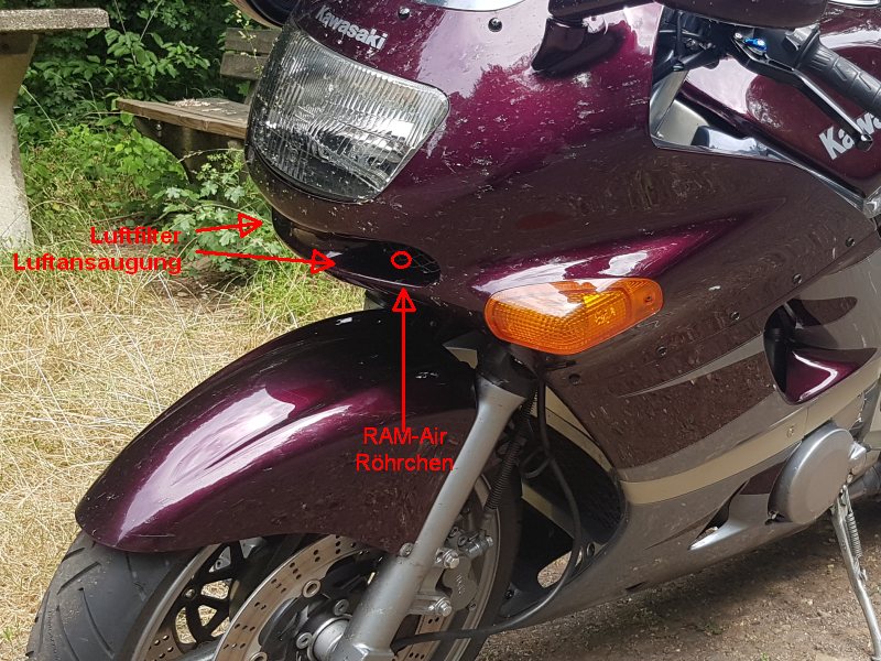 die eigentliche Luftzufuhr des RAM-Air sind dann diese kleinen Röhrchen die direkt hinter dem (Ansaug-)Gitter vorne an der Verkleidung zu sehen sind