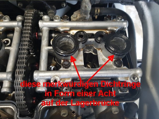 -> zwischen Nocken-Lagerbrücke und Zylinder gehören O-Ringe, je zwei größere & zwei kleinere