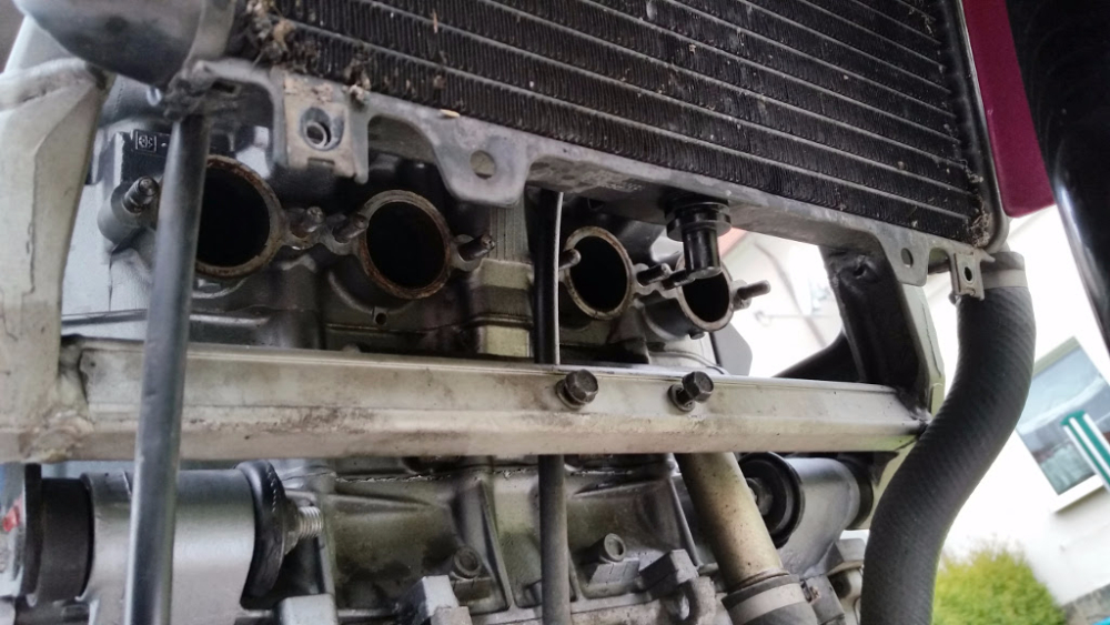 - Krümmer demontiert, dazu mit Gelenkstücken am Werkzeug am Wasserkühler vorbei geschraubt, Wasserkühler konnte also am Mopped verbleiben