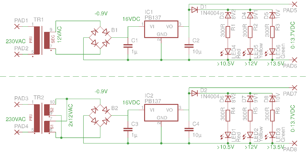 Wie man auf dem Schaltplan sieht kommt das ganze mit sehr wenig Komponenten aus. Ein Trafo, Brückengleichrichter, der PB137 und zwei Kondensatoren. Der Rest sind Extras, zum anzeigen der aktuellen Akkuspannung.