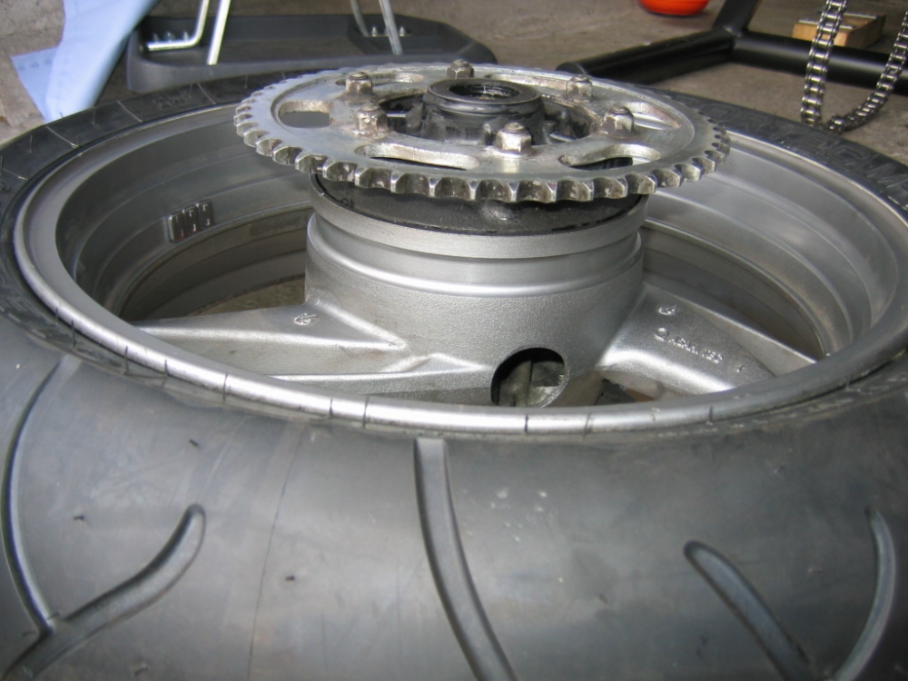Wir legen den Ruckdämpfer in das Kettenrad und dieses drücken wir wieder auf die Felge .. sacht und nicht verkanten !! Nun schmieren wir die Einführseite der Abstandshalter mit etwas Fett ein. Es dient der Finger , das ganze zu verteilen. Diese dann auf die Lager in die Felgen stecken. (ja, die gucken noch nen Stück raus !) Nun können wir das Rad in die Schwinge rollen und die Kette einhängen. Nun fetten wir noch eben die Achse... Jetzt klappen wir die Halterung für den Bremssattel wieder nach unten und arritieren sie mittig zum Achsloch Fast fertig... für die Achszusammenkunft.... Reifen mit dem Fuß untermauern und hochhalten, dass die Achse durchgesteckt werden kann.