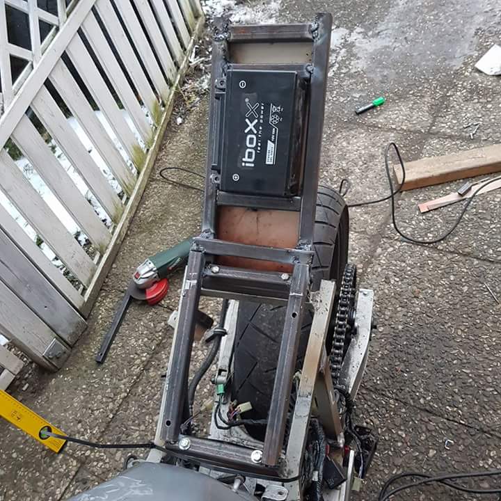gelöst. Das orange Blech wird durch ein schraubbares von unten getauscht. Um auf alles schnellen Zugriff zu haben. Die Gelbatterie wird gegen eine Lithium Ionen Batterie getauscht. Selbe Größe wie die Gelbatterie. Allerdings weniger Gewicht und mehr Power.