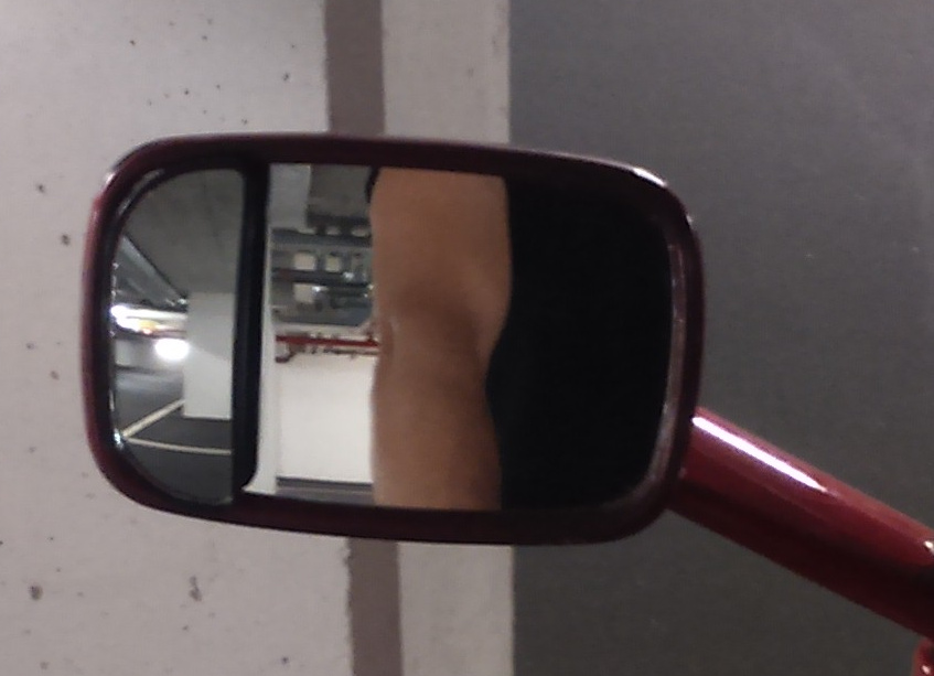 Spiegel so eingestellt, dass er den Verkehr direkt hinter mir zeigt. Dazu ein kleiner Zusatzspiegel, der den Bereich schräg hinter mir zeigt.