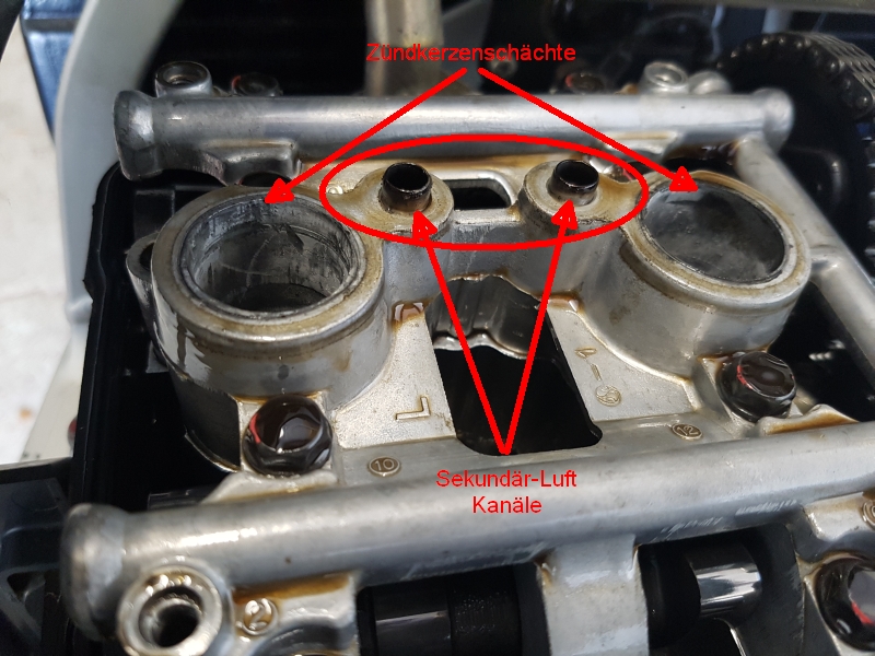 Alles montiertbund 24h trocknen lassen bis ich wieder testen konnte. Dichtung scheint nun dicht zu halten aber irgendwo kommt immer noch Öl raus. Also heute alles wieder runter und dann viel mir am luftverteiler an der linken Seite schon das hier auf: Dann sah ich dass eine leichte ölspur von den 2 mittleren schrauben kam Und durch die Öffnung der linken luftkammer sah ich schon das Öl stehen. Ich öffnete den Deckel und reinigen erstmal fix den Bereich so dass der scheiss mir nicht auf den Motorblock laufen kann. Hier ein Bild nach der groben Reinigung: Wie man sehen kann steht da das Öl noch drinn. Was für eine Funktion haben diese Teile? Luft in den Motorraum pressen??