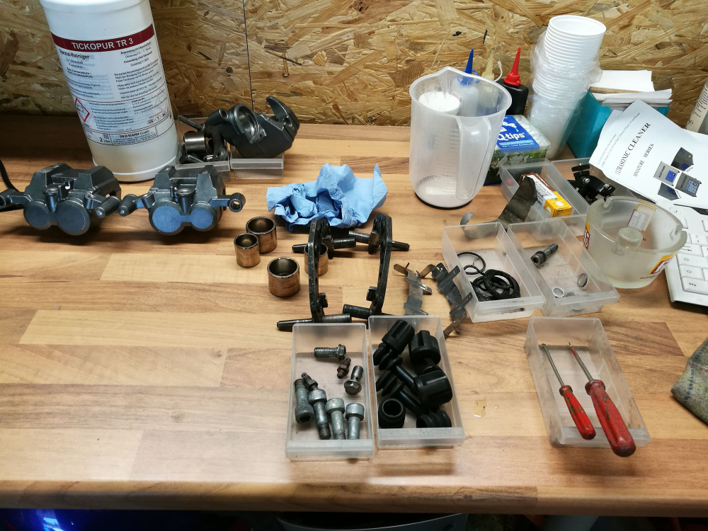 meine Bremssättel waren in der Regel recht eingesaut. Sie haben jahrelang keine Aufmerksamkeit, Pflege und Bürste gesehen. Um so schwieriger gestalltet sich das Aufarbeiten und Reinigen...